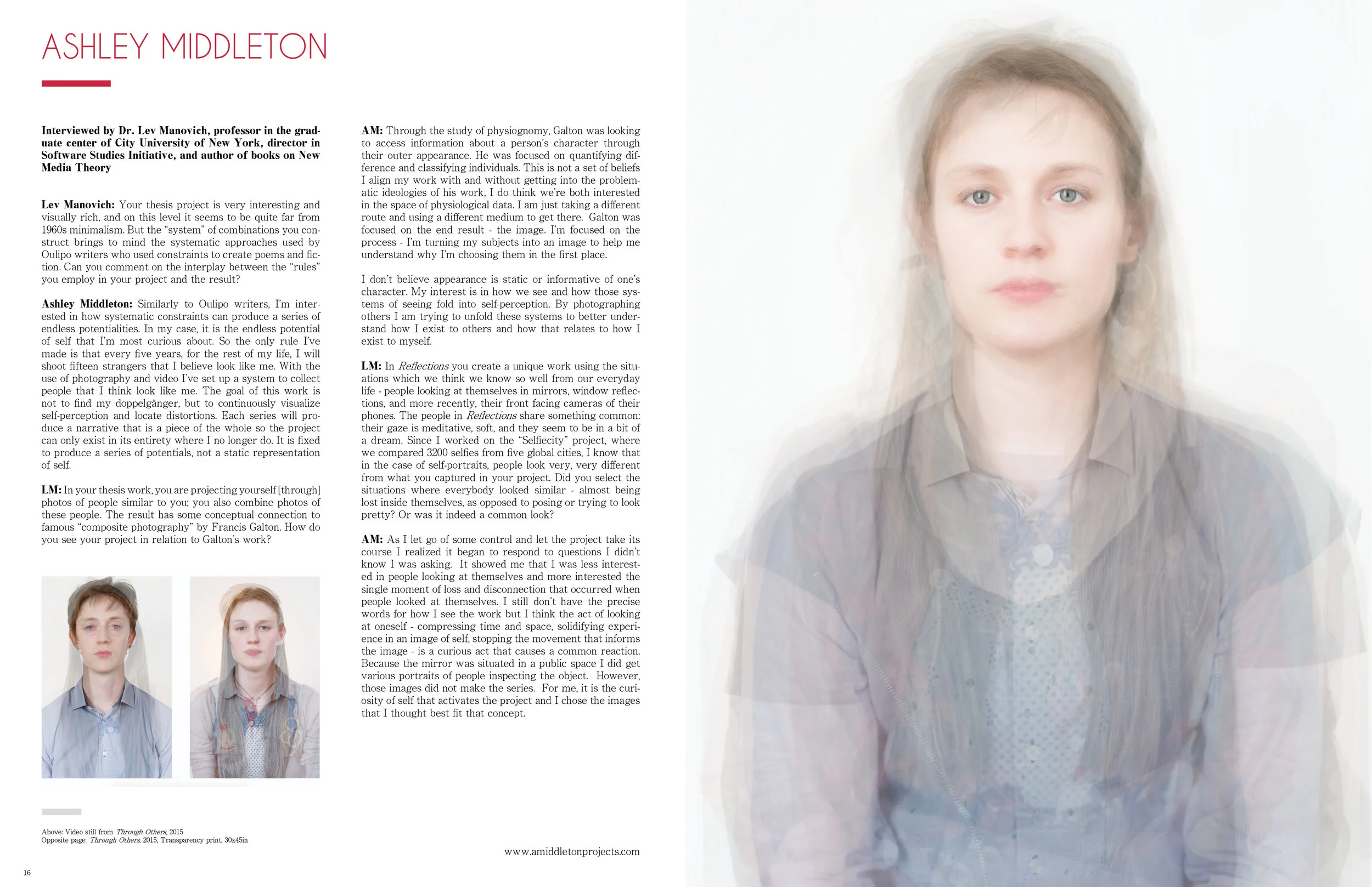 LM: In your thesis work, you are projecting yourself [through] photos of people similar to you; you also combine photos of these people. The result has some conceptual connection to famous “composite photography” by Francis Galton. How do you see your project in relation to Galton’s work?